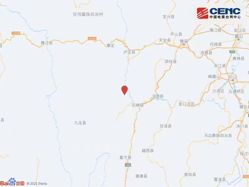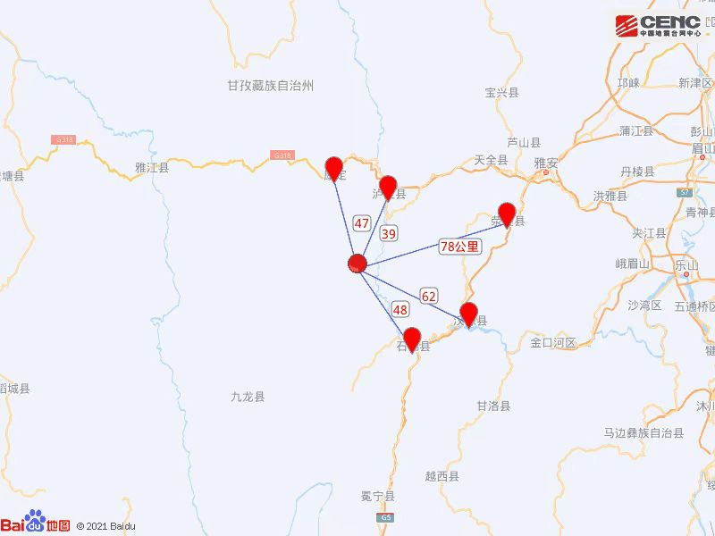 周边县城:震中距泸定县39公里、距康定市47公里、距石棉县48公里、距汉源县62公里、距荥经县78公里,距甘孜藏族自治州52公里,距成都市226公里。