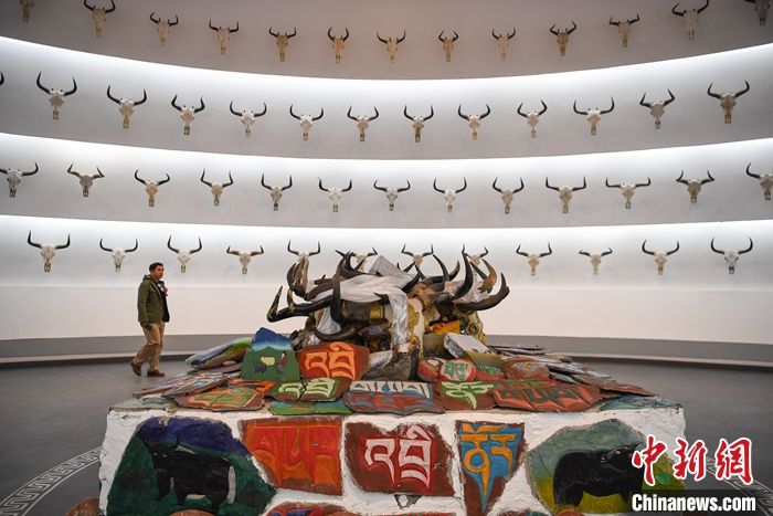 图为西藏牦牛博物馆感恩展厅内,墙上悬挂的牦牛头骨。 中新社记者 贡嘎来松 摄