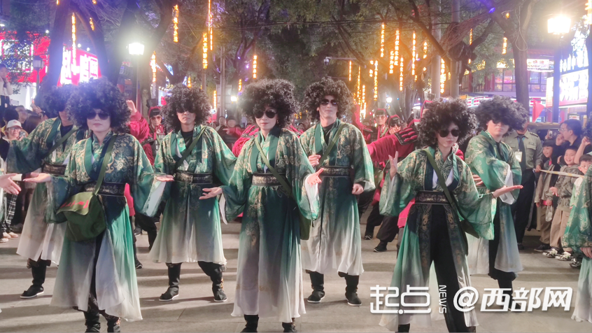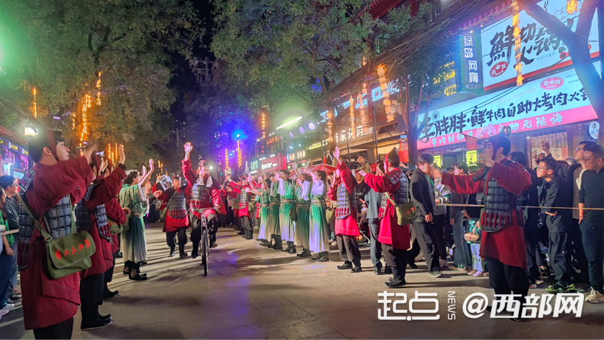 活动现场热闹非凡。10月2日19时,“俑动渭城”快闪巡游拉开序幕。30名身着秦俑战甲的舞者组成整齐方阵,铠甲在灯光下泛着沉稳光泽,步伐铿锵间自带历史厚重感。他们缓缓前行,身后的场景随舞步流转,从60年代的红砖瓦舍、70年代的自行车流,到00年代的霓虹闪烁,秦俑战甲与时代印记的碰撞,生动诠释着秦人坚韧不拔、勇往直前的精神在岁月中始终鲜活。