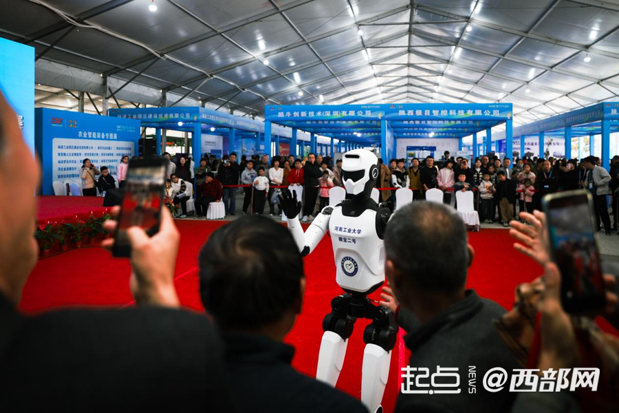农业智能装备专题展上,河南工业大学研发的机器人与观众打招呼互动。