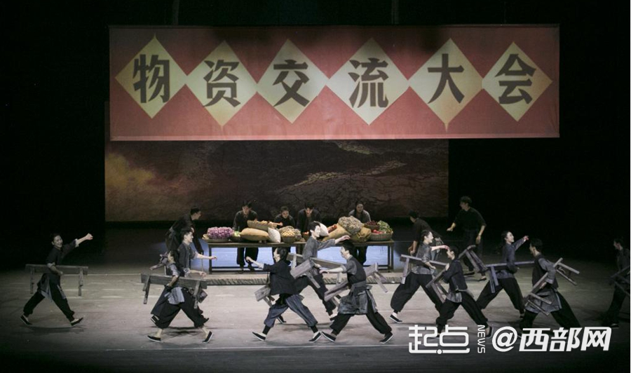 当舞台上响起每个陕西人都刻在DNA里的《三滴血》唱段,充满烟火气的舞蹈瞬间勾连起“老陕”观众的乡土记忆。“物资交流大会”段落,主创团队以关中赶会的真实场景为创作蓝本,将生活细节与舞蹈深度融合:舞者们复刻老陕坐在长条凳上看戏的松弛姿态,有人踮脚探头寻望戏台、有人侧身与邻座搭话聊天;《陕西楞娃》以华阴老腔的韵律为基底,舞者们挺胸抬头的姿态、顿挫有力的步伐,将陕西汉子的粗犷豪迈展现得淋漓尽致,把陕西人记忆里热闹的赶会场景,鲜活地搬上了舞台。