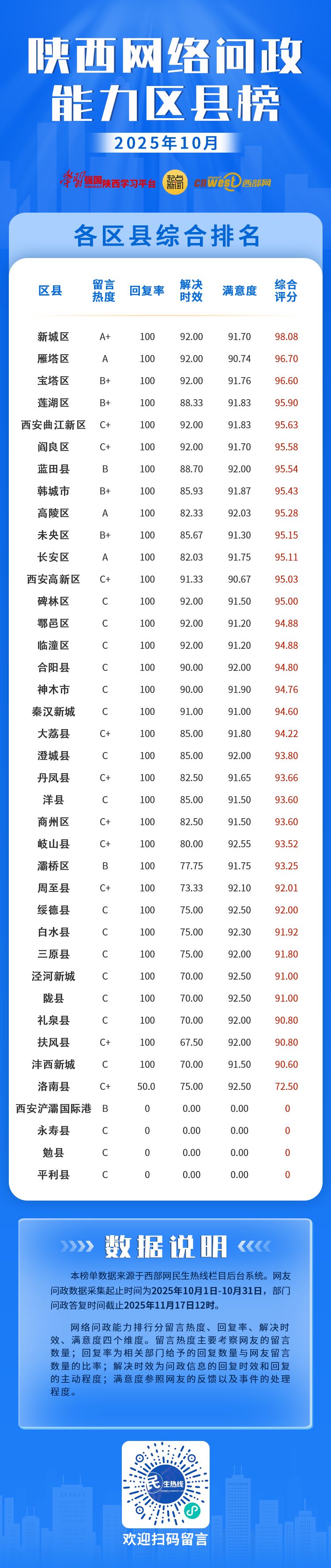 2025年10月,西部网民生热线与陕西39个区县(开发区)进行了网络问政沟通对接。根据各区县(开发区)留言热度、回复情况和网友满意度的综合评定,西安新城区、西安雁塔区、延安宝塔区分别以总分98.08、96.70、96.60位列网络问政能力10月区县榜前三名。
