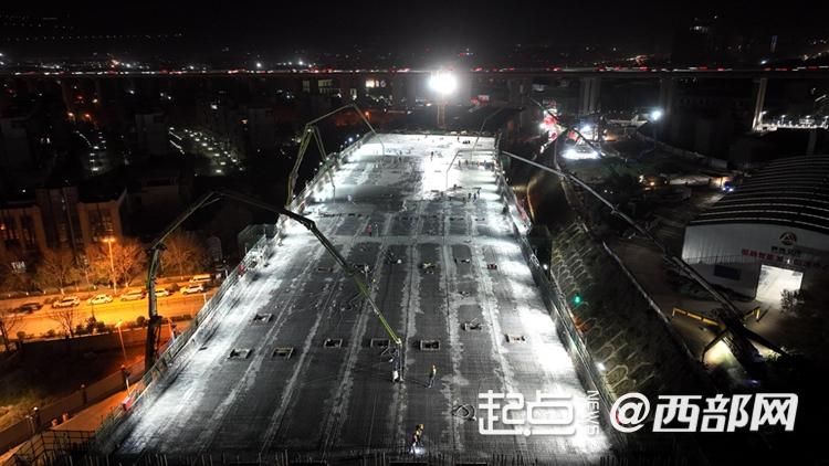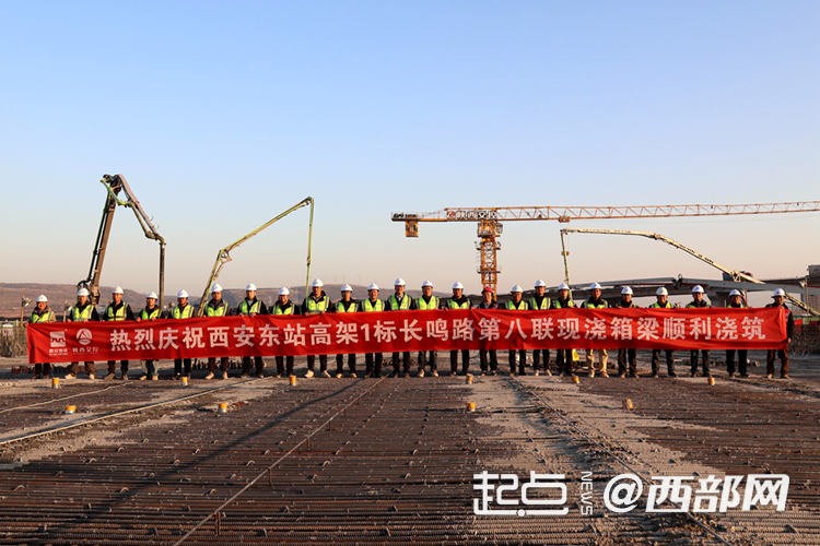 12月8日,历经47小时连续施工,西安东站高架快速路系统及节点立交工程长鸣路—南绕城高速立交长鸣路高架桥第八联现浇箱梁顺利完成浇筑,这是目前国内一次性连续浇筑方量最大的大跨径变截面预应力现浇连续箱梁。