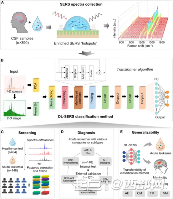 基于SERS光谱和深度学习(DeepLearning,DL)策略的DL-SERS分类方法:(A)光谱数据采集;(B)DL-SERS分类方法;(C)急性白血病筛查;(D)不同类别或亚型急性白血病诊断;(E)模型通用性