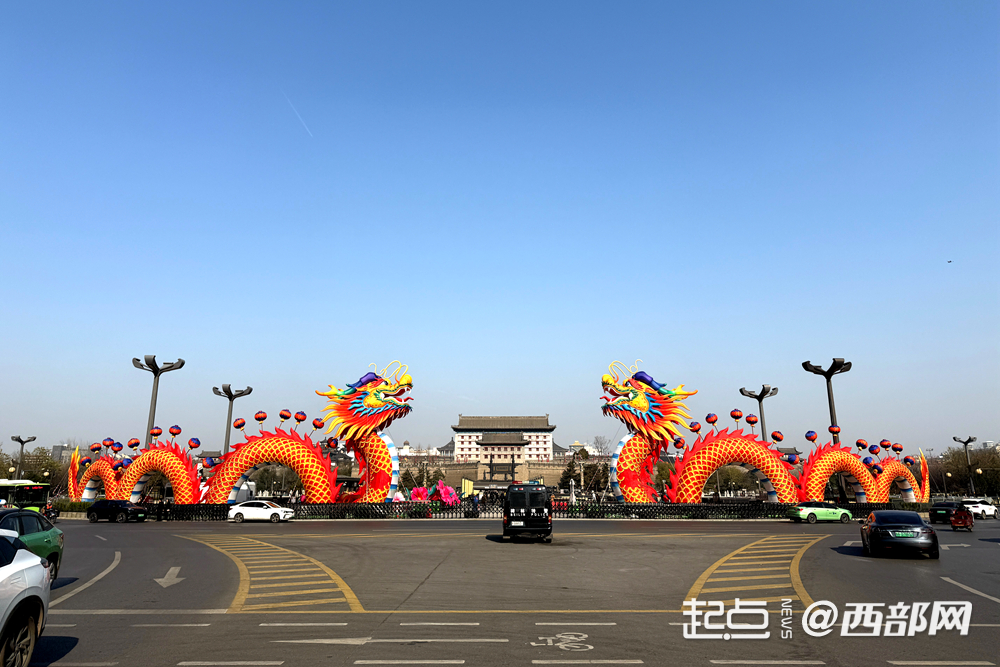 被网友戏称为西安城墙“大唐经理”的两条龙型花灯已于16日夜间安装完毕