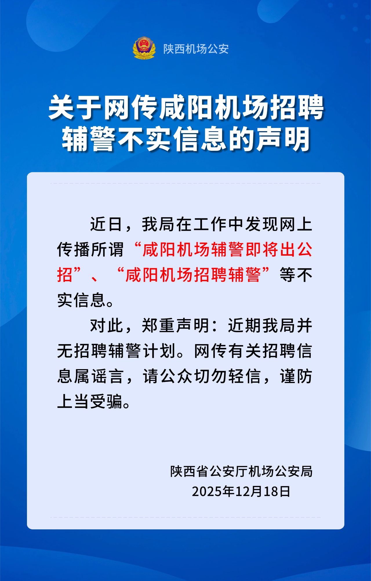 对此,陕西机场公安郑重声明:近期并无招聘辅警计划,网传有关招聘信息均属谣言。