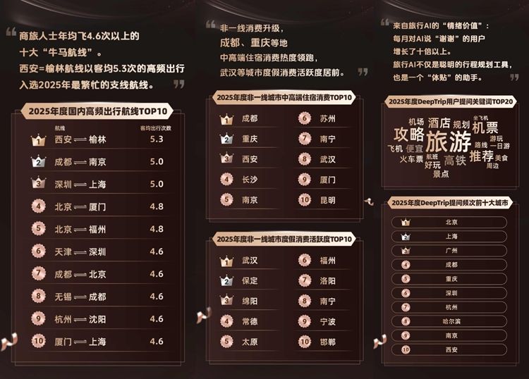 此外,根据同程旅行DeepTrip2025年3月至12月的数据,西安上榜2025年度DeepTrip提问频次前十大城市,体现出西安市民及游客对旅游信息的高度关注与主动获取意愿,展现出本地旅游市场浓厚的探索氛围与消费活力。