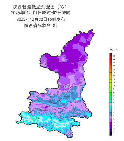 2026年1月1日:陕北北部-15~-6℃,陕北南部、关中西部和北部、秦岭山区-10~-1℃,关中平原-4~2℃,汉中、安康-3~6℃,商洛及巴山沿线-10~3℃。