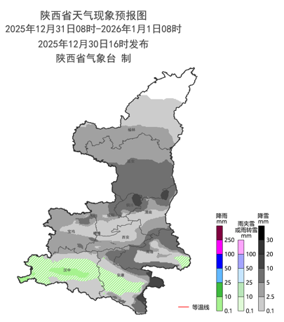 2025年12月31日:榆林大部有小到中雪,延安、关中北部及西部部分、秦岭山区有中到大雪,关中平原有雨夹雪转小到中雪,陕南河谷地区小雨转雨夹雪,巴山有雨夹雪转中到大雪。延安南部局地(黄陵县)、铜川北部局地(宜君县)、渭南北部局地(合阳县)、咸阳北部局地(旬邑县)、秦巴山区(镇巴县、紫阳县、岚皋县、平利县、镇坪县、旬阳市、白河县)局地有暴雪。