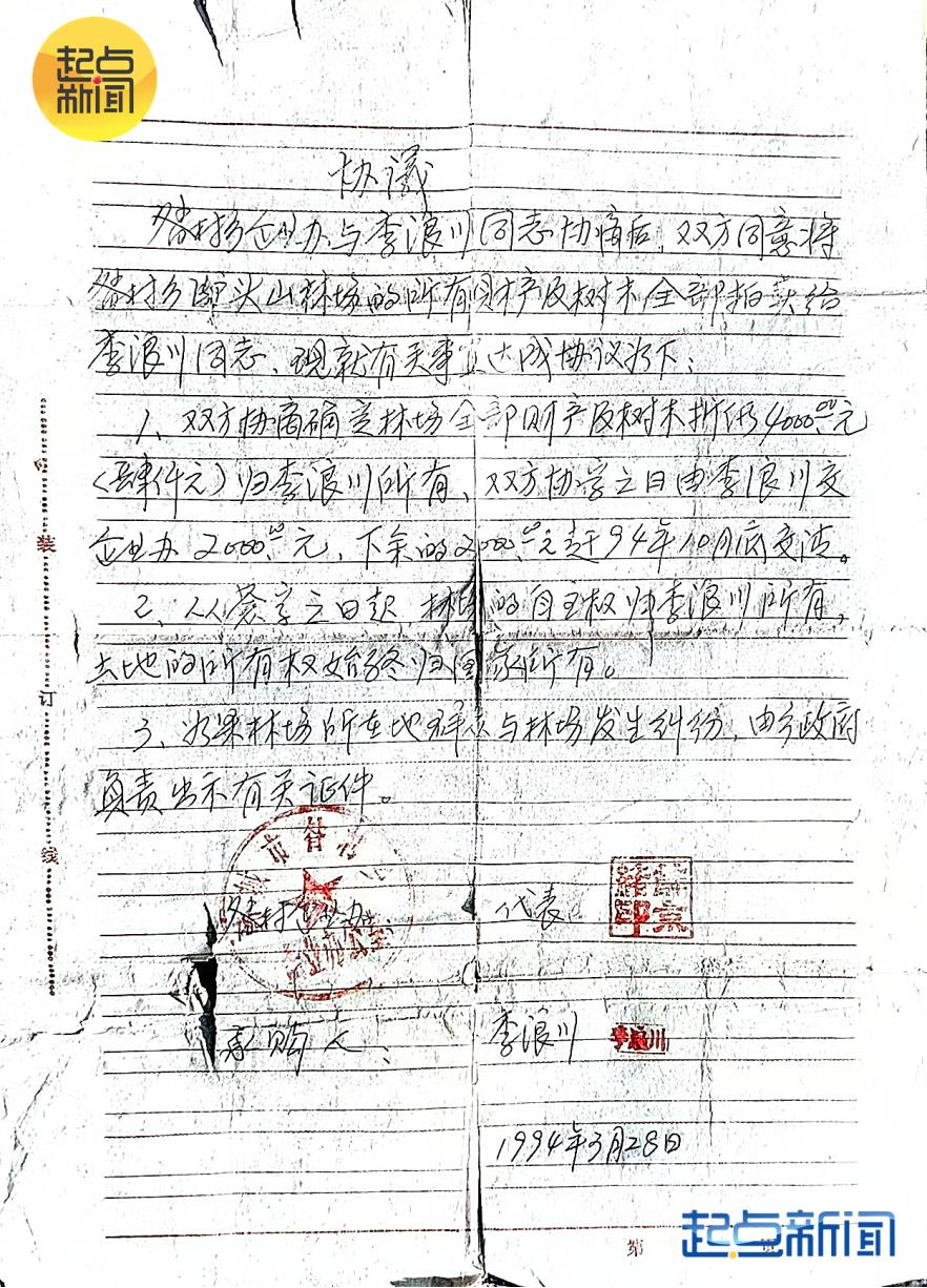 “这片就是驴头山林场,1973年建成时叫昝村乡社办林场。1994年,我岳父李浪川与昝村乡企业办公室签订协议,以4000元价格承包了驴头山林场。”2025年12月18日,在韩城市西庄镇驴头山林场,梁师傅向记者展示了当年的承包协议原件。“你看,这就是当时白纸黑字签的协议。”