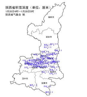 1月18日下午开始,陕西出现雨雪天气,延安南部、关中出现小雪或雨夹雪,陕南出现小雨转雨夹雪或小到中雪,商洛局地大到暴雪。截至今早5时,48个区县有积雪:商洛市积雪1.0~3.0厘米、宝鸡市积雪1.0~5.0厘米、铜川市积雪2.0~3.0厘米、渭南市积雪1.0~7.0厘米、西安市积雪1.0~3.0厘米、延安市积雪2.0~4.0厘米、安康市积雪1.0~3.0厘米、汉中市积雪1.0~1.0厘米、咸阳市积雪1.0~4.0厘米。