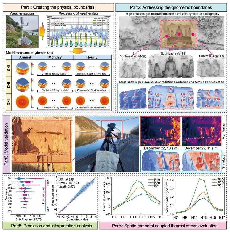 在气候变化背景下,石窟寺、摩崖造像等半开放文化遗产长期暴露于自然环境中,太阳辐射引起的温度梯度变化会导致岩体裂隙扩展、表层剥落等渐进性损伤。这类过程比强风、暴雨等突发灾害更隐蔽持久,且难以大尺度精准评估。西安建大研究团队创新性引入太阳辐射驱动热应力作为遗产表面环境影响评估新指标,建立“实测—模拟—预测—解释”一体化研究框架。