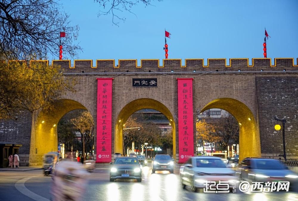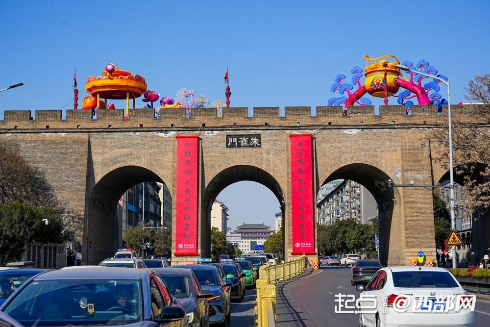 随着春节临近,西安城墙已陆续在永宁门、长乐门、和平门、建国门、朝阳门等16座城门悬挂起巨幅春联,红底浓墨映着千年城砖,将古城西安装扮得喜气洋洋。