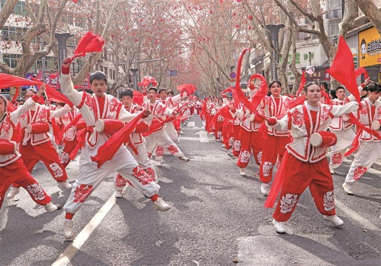 2月27日,安康市举行社火巡游。20余支队伍的千余名表演者通过舞龙舞狮、汉调二黄等特色民俗各展绝活,为游客带来一场文化盛宴。图为腰鼓表演现场。 记者 董剑南摄