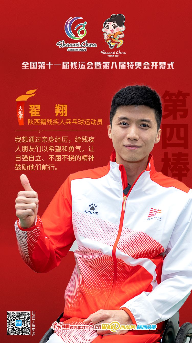 场内火炬传递第四棒火炬手是陕西籍残疾人乒乓球运动员翟翔。他是十四运会和残特奥会的圣火采集手。曾获里约残奥会和东京残奥会男子乒乓球团体金牌。