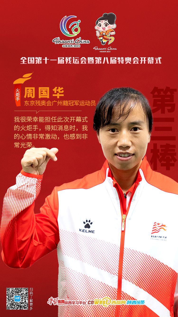 场内火炬传递第三棒火炬手是东京残奥会广东籍冠军运动员周国华。她曾获2012年伦敦残奥会、2014年仁川亚残运会女子盲人100米冠军,2016年里约残奥会女子盲人4x100米接力冠军。