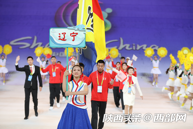 西部网讯 10月22日晚,全国第十一届残运会暨第八届特奥会开幕式在西安奥体中心体育馆举行。辽宁省代表团入场。
