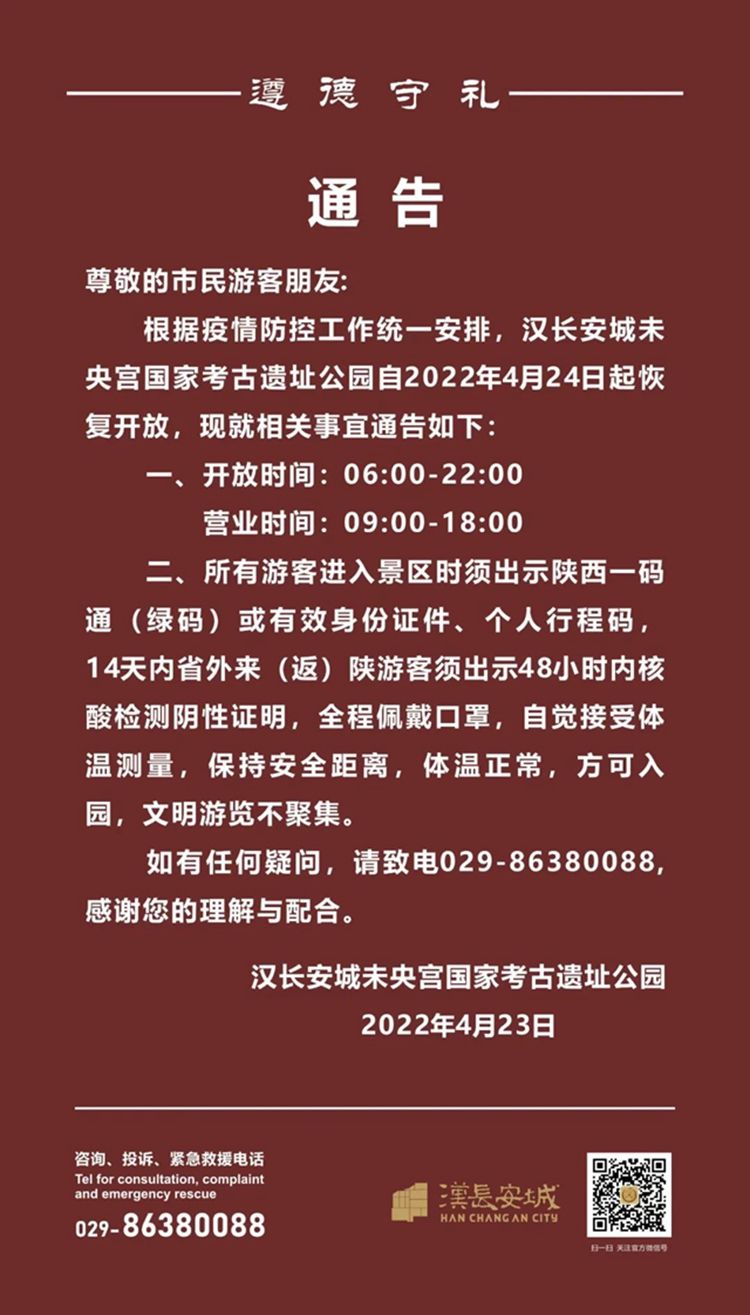 西部网讯 今天(4月23日),汉长安城未央宫国家考古遗址公园发布通告称,景区将于4月24日起恢复开放。