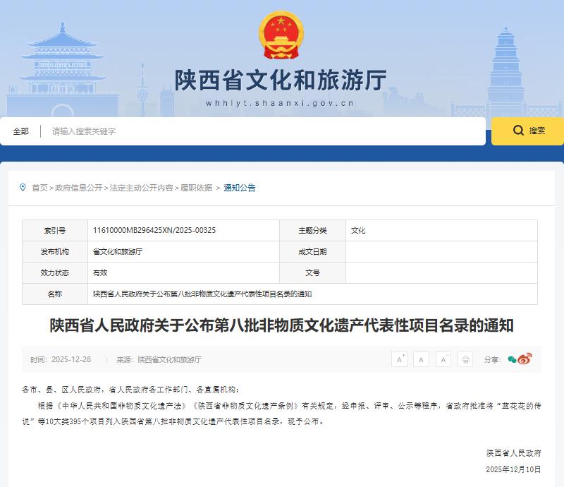 起点新闻·西部网记者今日(12月29日)从陕西省文化和旅游厅获悉,陕西省人民政府于近日公布了陕西省第八批非物质文化遗产代表性项目名录,共有“蓝花花的传说”等10大类395个项目成功入选。至此,陕西省级非物质文化遗产代表性项目总数达到1161项,跃居全国第一方阵。